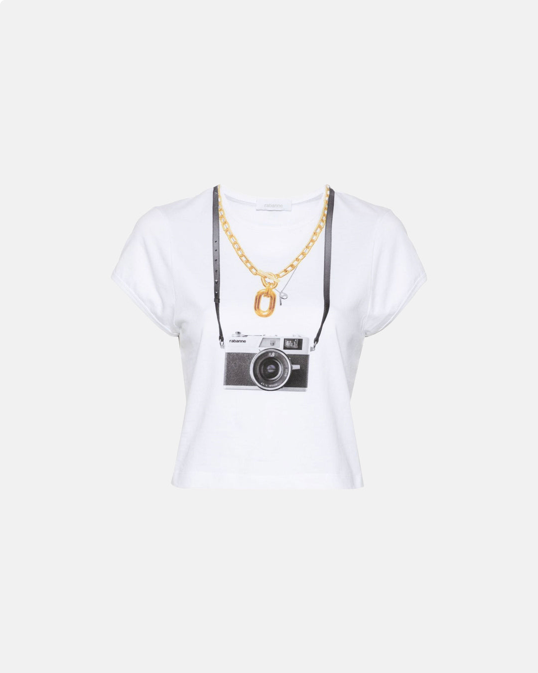 DescripciÜn: Playera blanca en jersey de algodÜn con c_mara vintage estampada en el pecho; gui_o pop a los 70 s. :contentReference[oaicite:0]{index=0}