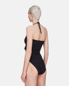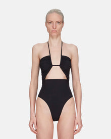 DescripciÜn: Ba_ador negro con cortes _prong” y escote limpio; minimal y gr_fico.
