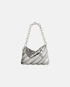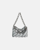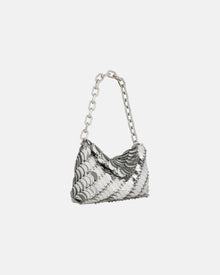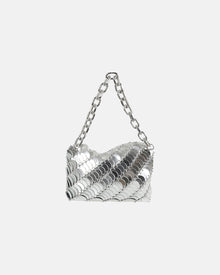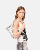 Descripci—n: Clutch de discos de piel plateada ensamblados sobre malla; minimalismo de alto brillo. :contentReference[oaicite:14]{index=14}